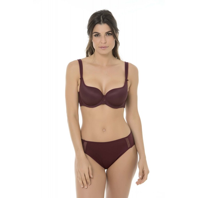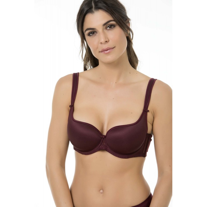 Sujetador esencial moldeador con efecto envolvente. Un modelo clásico, práctico y muy cómodo. Fabricado en un tejido ligero que no marca costuras y garantiza sujeción. De color berenjena.