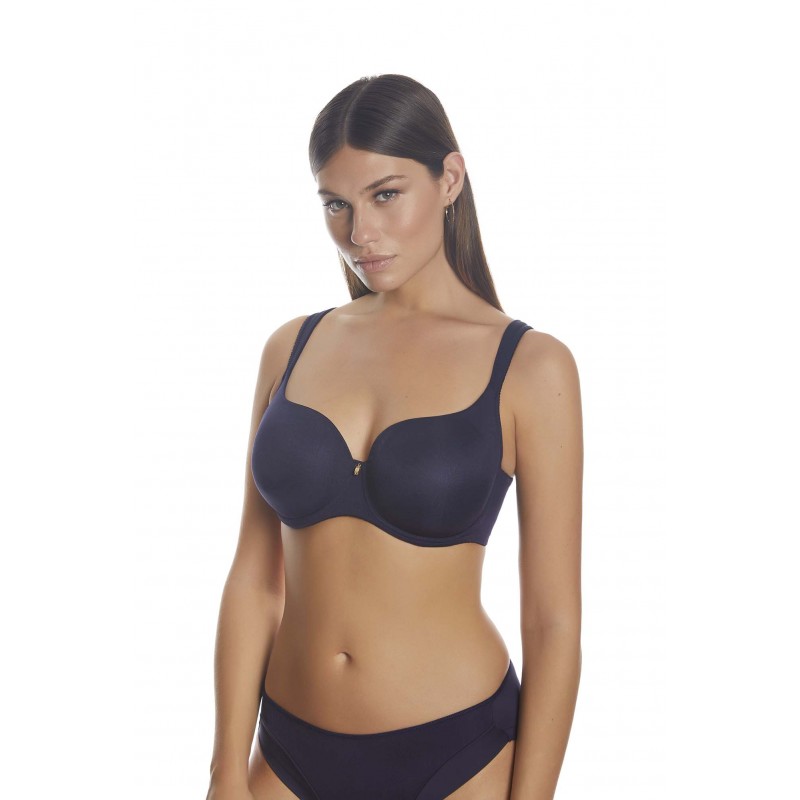 Sujetador esencial moldeador. Efecto envolvente. La combinación del brillo de sus tejidos lo convierten en una pieza elegante. La copa es más alta y tapada para garantizar una mayor sujeción a las tallas más grandes. Sus tirantes están acolchados para aportar un plus de comodidad.