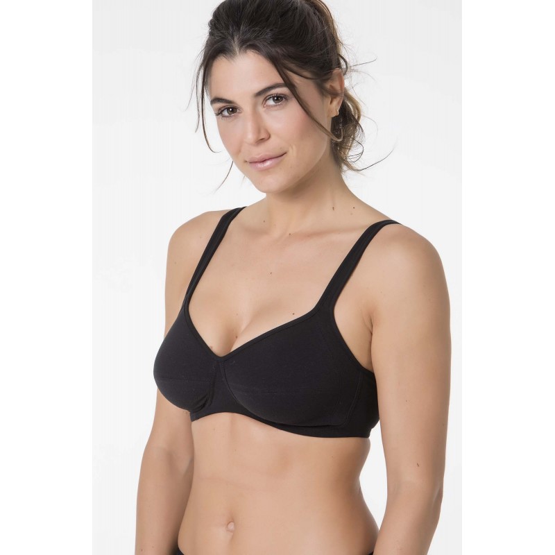 Sujetador de algodón hipoalergénico sin aros. Desarrollado para los procesos de radioterapia o para pieles sensibles a las que cualquier elemento sintético, al contacto con la piel, les deja señales propias de un comportamiento alérgico. Sujetador hecho 100% con materiales hipoalergénicos, con tirantes acolchados y sin costuras al contacto con la piel. De color negro.