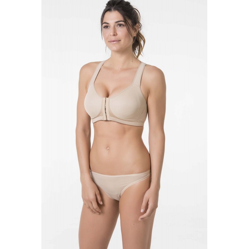 Sujetador post-operatorio de presión media con apertura delantera. Aporta sujeción extra para presionar. Con costuras sin uniones. Transpirable. La base interior es de Foam laminada en algodón. Prehormado con tejido rígido y tirante acolchado regulable en altura. De color piel.