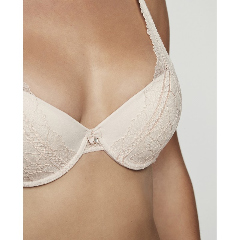 Sujetador efecto push up con escote pronunciado y encaje floral. Reafirma el pecho y aumenta hasta una talla. Cuenta con aros y copas de foam push up. Sin base. Sus tirantes tienen hebillas planas que no abultan y, además, cuentan con ganchos multiposición que permiten unirlos en la parte superior de la espalda para lucir un escote halter o una espalda de nadadora sin que queden a la vista. Una prenda delicada y sofisticada. La colección Agatha, a la que pertenece, encarna la madurez y el esplendor de la marca, ofreciendo piezas que no solo adornan, sino que transforman. Una colección con encanto y carisma.