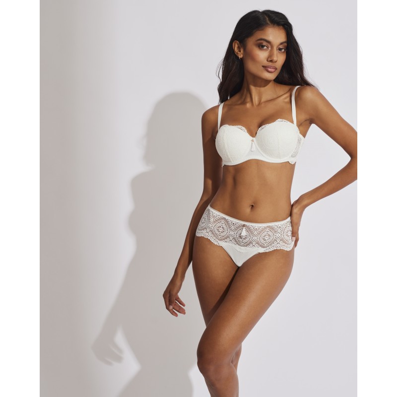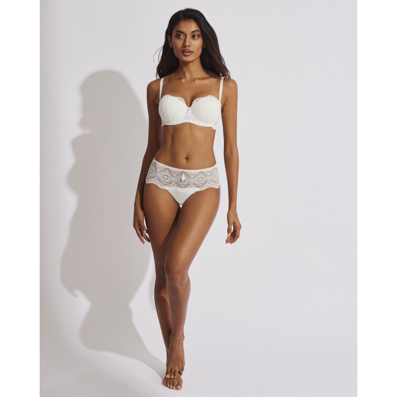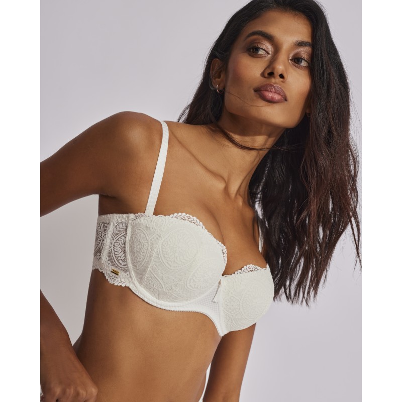 Sujetador sin tirantes con relleno. Efecto push up, realza el pecho y aumenta hasta una talla. Su espectacular diseño de encaje le otorga un estilo romántico y bohemio a la vez. Este prenda conjuga sensualidad, frescura y elegancia, ideal para mujeres libres y auténticas.