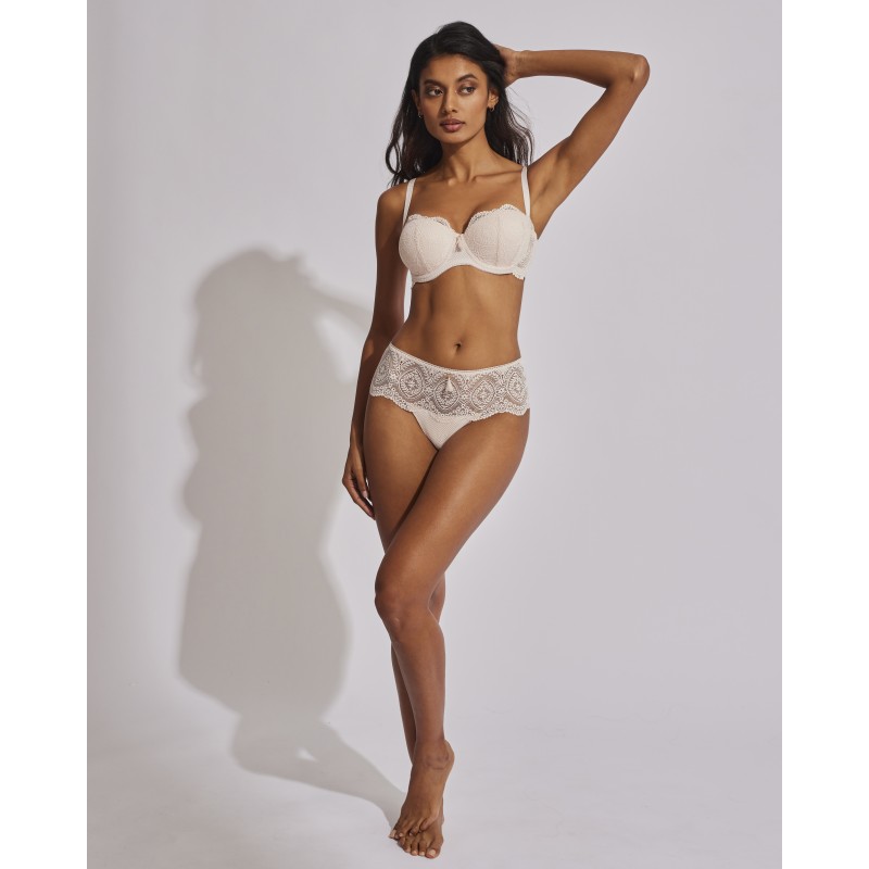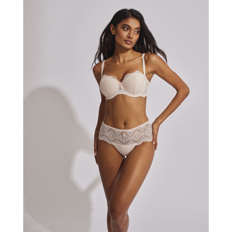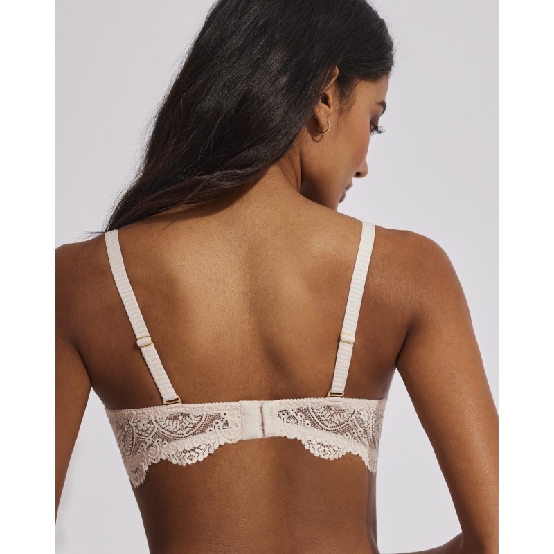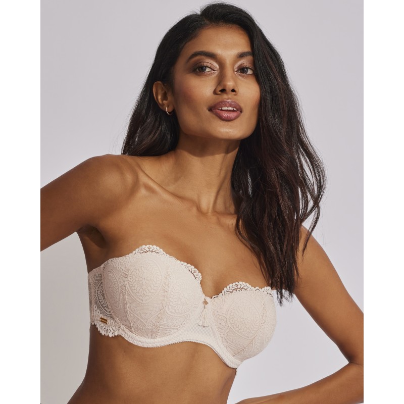 Sujetador sin tirantes con relleno. Efecto push up, realza el pecho y aumenta hasta una talla. Su espectacular diseño de encaje le otorga un estilo romántico y bohemio a la vez. Este prenda conjuga sensualidad, frescura y elegancia, ideal para mujeres libres y auténticas.