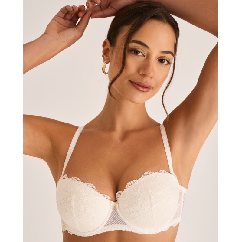Sujetador sin tirantes con push up. Se incluyen tirantes extraibles para colocar siempre que se quiera. Cuenta con aros y copa interior de foam con push up. Tiene varillas laterales, base antideslizante, y ribete de silicona para evitar el indeseado efecto de deslizamiento. Es una pieza que fusiona elegancia y confort, diseñada para mujeres reales, libres y seguras. Pertenece a la colección Manuela, pensada para realzar la belleza que nace desde dentro celebrando la autenticidad de cada mujer. Para quienes quieren sentirse no solo bellas, sino cómodas y seguras en su propia piel.