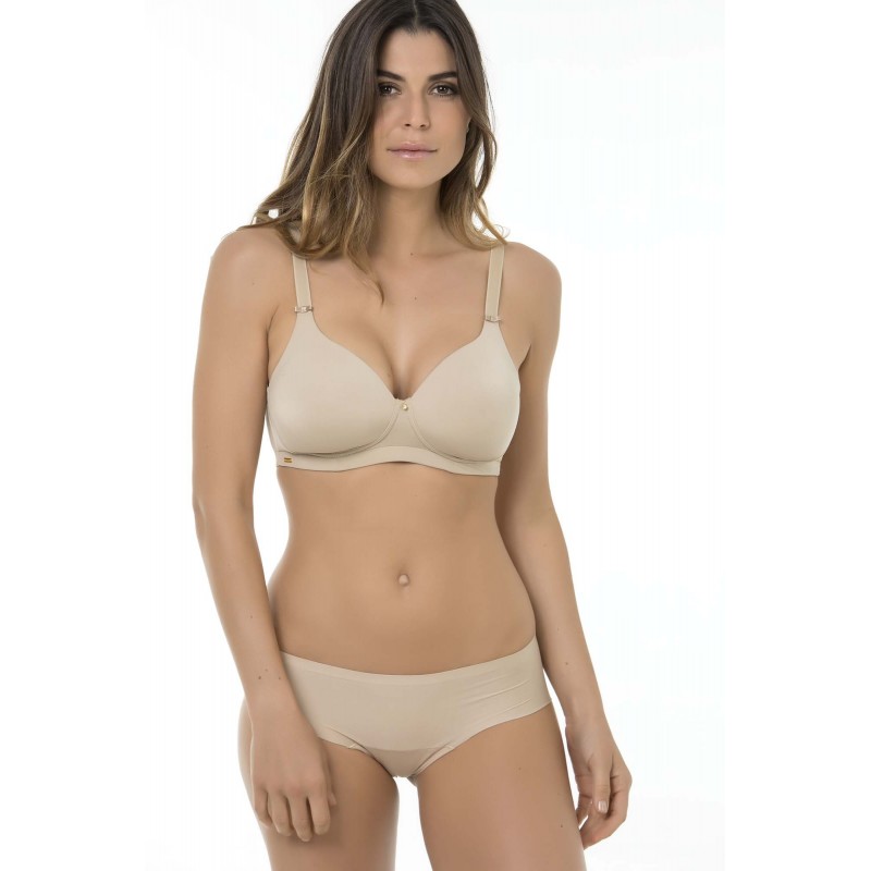 Sujetador esencial sin aros. Envuelve y moldea el pecho. Efecto segunda piel, cómodo, sencillo y suave. De color piel.