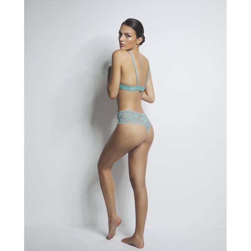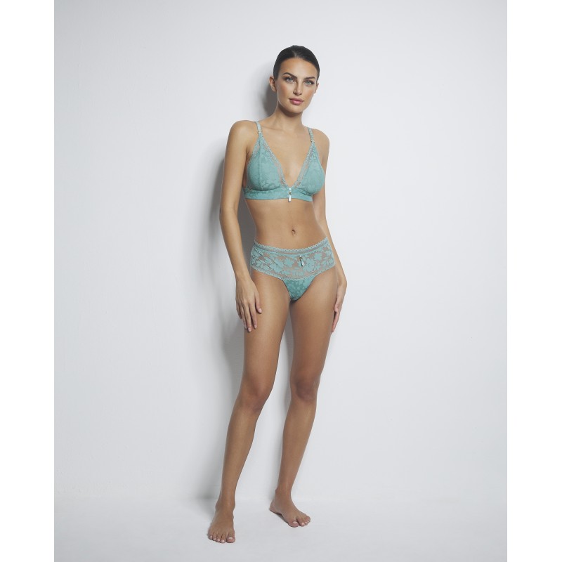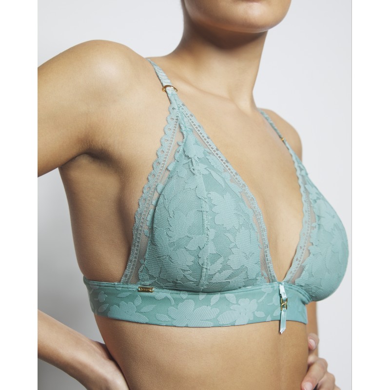 Sujetador triangular sin aro y con copa de foam. Aporta un extra de confort. Esta prenda es una promesa de momentos especiales, un toque de misterio y seducción que transforma el poder de la feminidad en su forma más refinada y cautivadora.