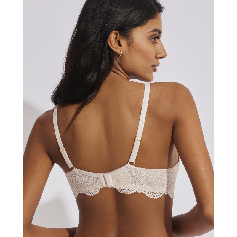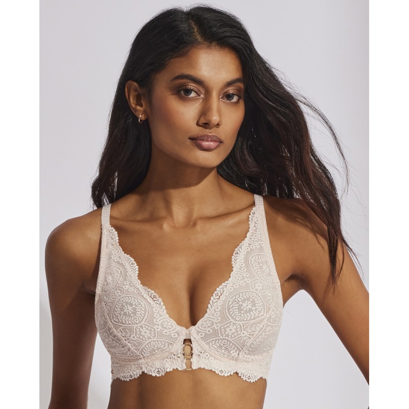 Sujetador triangular sin aro y con copa de foam. Aporta un extra de confort. Su espectacular diseño de encaje le otorga un estilo romántico y bohemio a la vez. Este prenda conjuga sensualidad, frescura y elegancia, ideal para mujeres libres y auténticas.