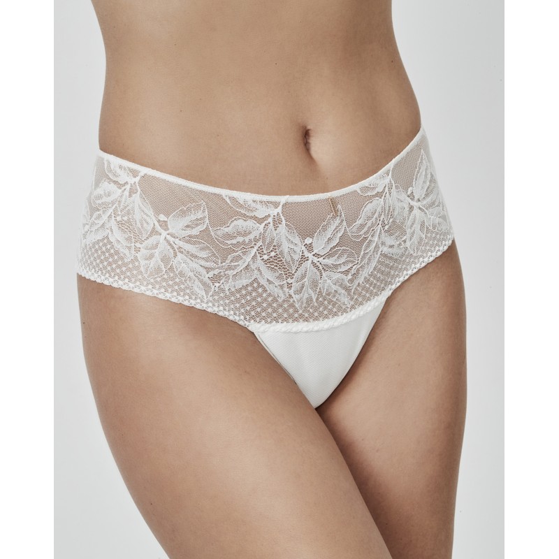 Braguita tanga de corte culotte con encaje floral tanto en la parte delantera como en la trasera, lo que aporta suavidad y detalle exquisito a la prenda. La goma de su cintura no marca. La colección Malitzia, a la que pertenece, representa una danza perfecta entre lo delicado y lo atrevido.