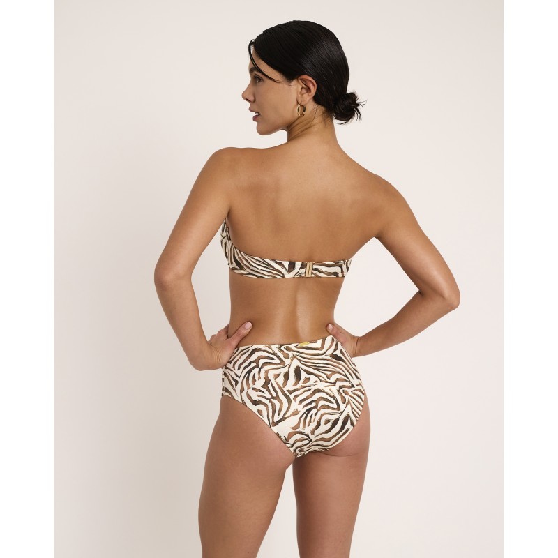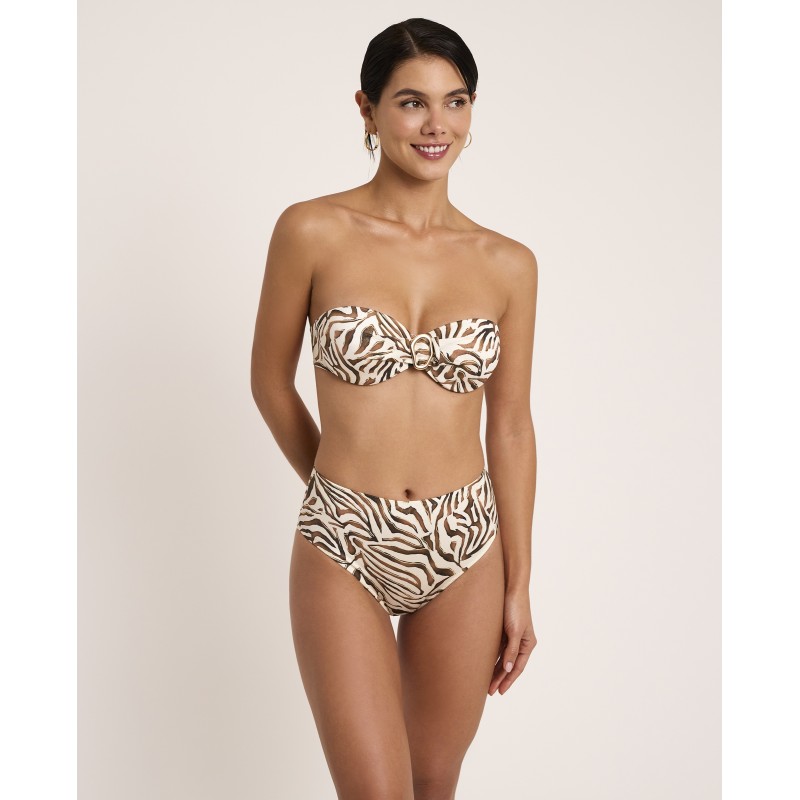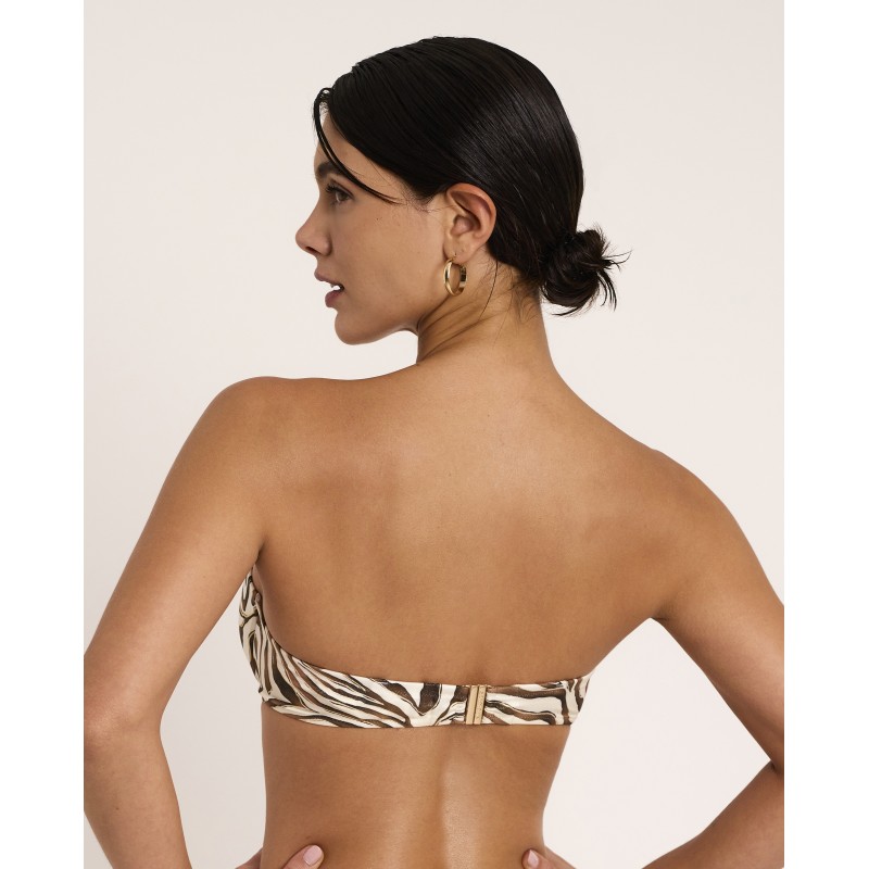 Top de bikini bandeau con aro y copa. Con tirantes extraíbles. Con un estampado animal print de trazo orgánico que transmite instinto, fuerza y libertad, celebrando una feminidad segura y poderosa. Pertenece a la colección Utopía donde lo imposible se transforma en realidad.