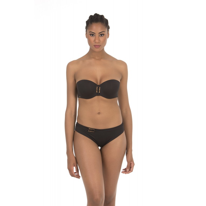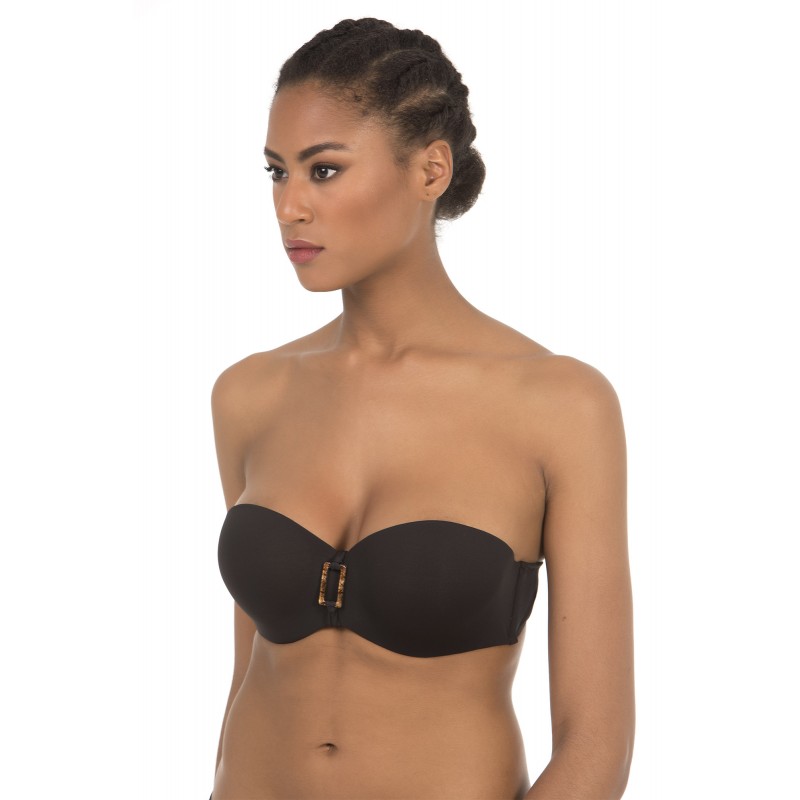 Top de bikini bandeau con aro y copa. Con tirantes extraíbles. Un diseño sencillo y atemporal. De color negro.