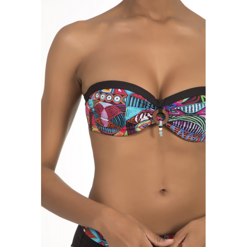 Top de bikini bandeau con aro y copa. Con tirantes extraíbles y estampado tribal. Con un pequeño adorno en el escote. De color negro.