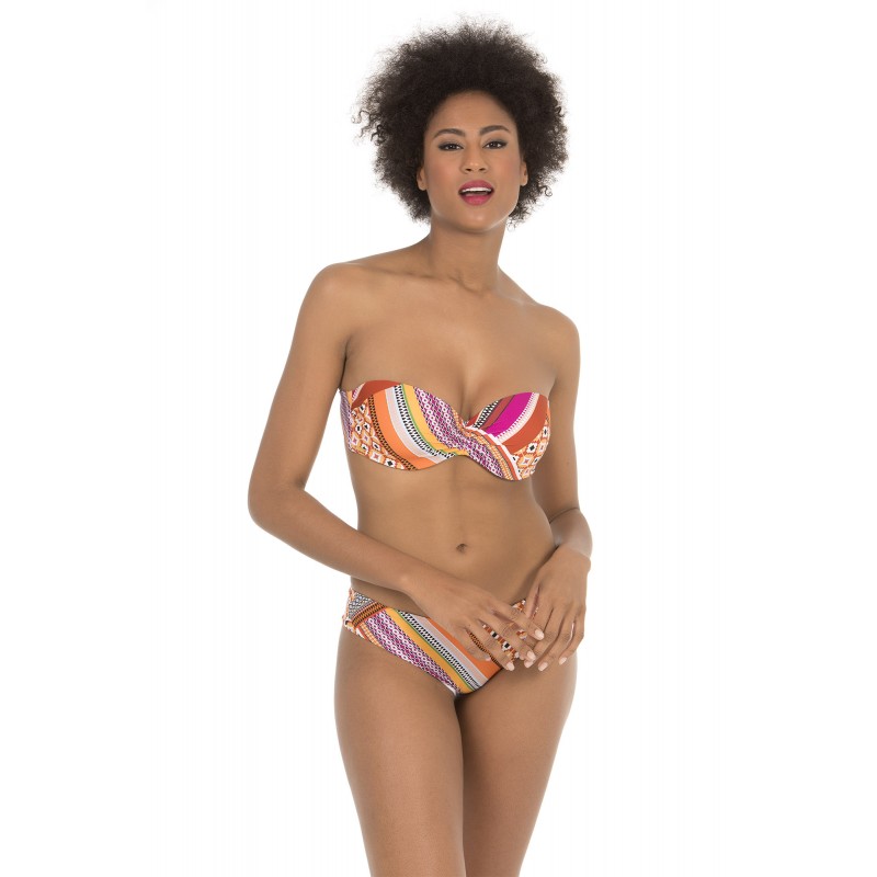 Top de bikini bandeau con aro y copa. Con tirantes extraíbles. Con estampado de pañuelo elegante y clásico y un pequeño adorno en el escote. De color rosa fucsia.