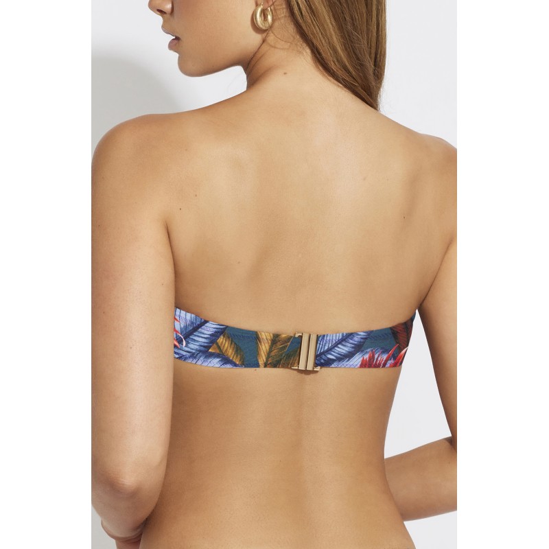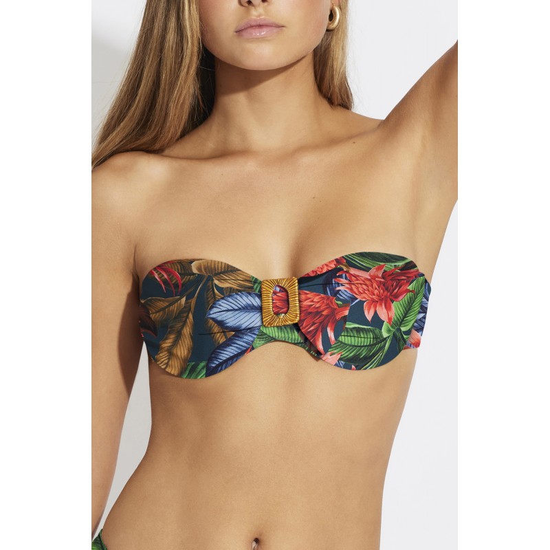 Top de bikini bandeau con aro y copa. Un diseño muy veraniego con estampado tropical. Una pieza cargada de color y frescura.