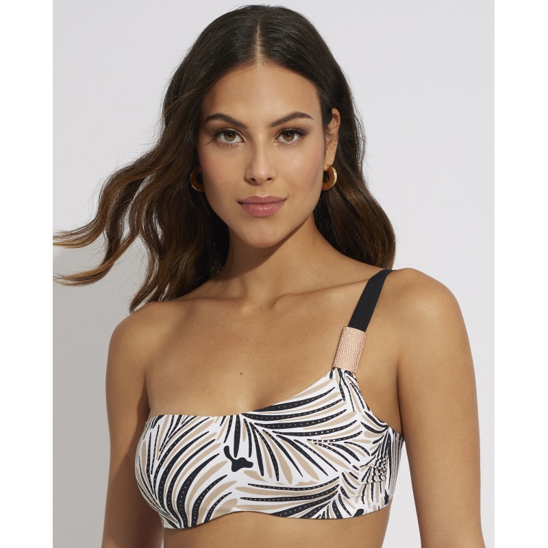 Top de bikini bandeau con copa extraíble y aro. Con tirantes extraíbles. Este estampado es la elección ideal para quienes buscan un look tropical y fresco. Las hojas de palmeras representan el exotismo y la belleza de los trópicos, transmitiendo una sensación de escapismo y libertad.