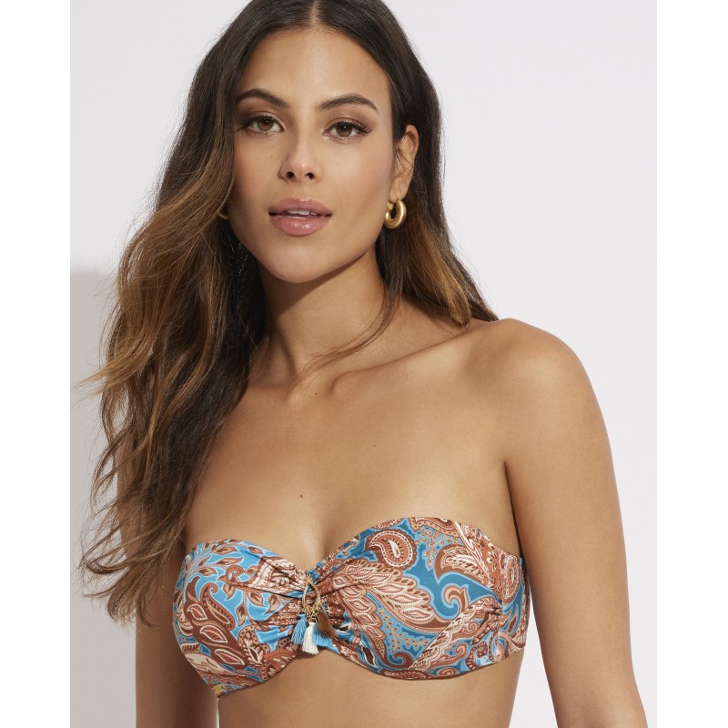 Top de bikini bandeau con copa extraíble y aro. Con tirantes extraíbles. Su diseño étnico le da un toque de originalidad y estilo único, haciendo que esta pieza sea diferente a los demás. Sus colores vibrantes resaltan tus curvas de una manera sutil pero impactante.