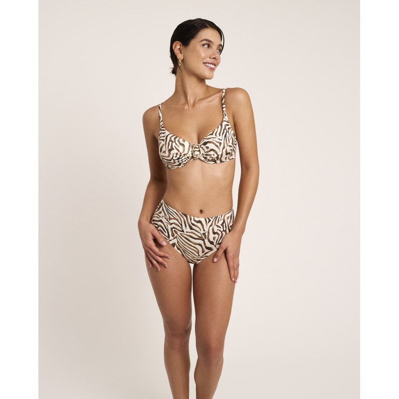 Top de bikini de capacidad sin foam. Con aro y tirantes ajustables para garantizar una sujeción perfecta. Con un estampado animal print de trazo orgánico que transmite instinto, fuerza y libertad, celebrando una feminidad segura y poderosa. Pertenece a la colección Utopía donde lo imposible se transforma en realidad.