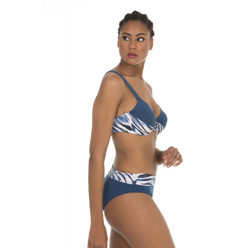 Top de bikini de capacidad, sin relleno. Con aro y tirantes anchos para una sujeción perfecta. De color liso combinado con estampado de cebra. De color azul.