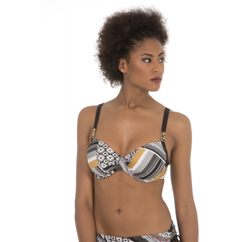 Top de bikini de capacidad, sin relleno. Con aro y tirantes anchos para una sujeción perfecta. Con estampado pañuelo. De color negro.