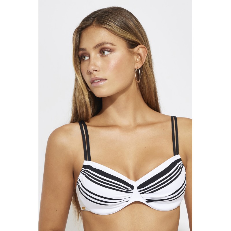 Top de bikini de capacidad sin foam. Con aro y tirantes ajustables para garantizar una sujeción perfecta. Su diseño en blanco y negro le otorga un estilo retro, elegante y seductor.