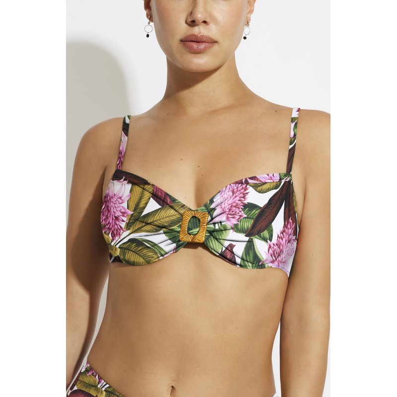 Top de bikini de capacidad sin foam. Con aro y tirantes ajustables para garantizar una sujeción perfecta. Un diseño muy veraniego con estampado tropical. Una pieza cargada de color y frescura.