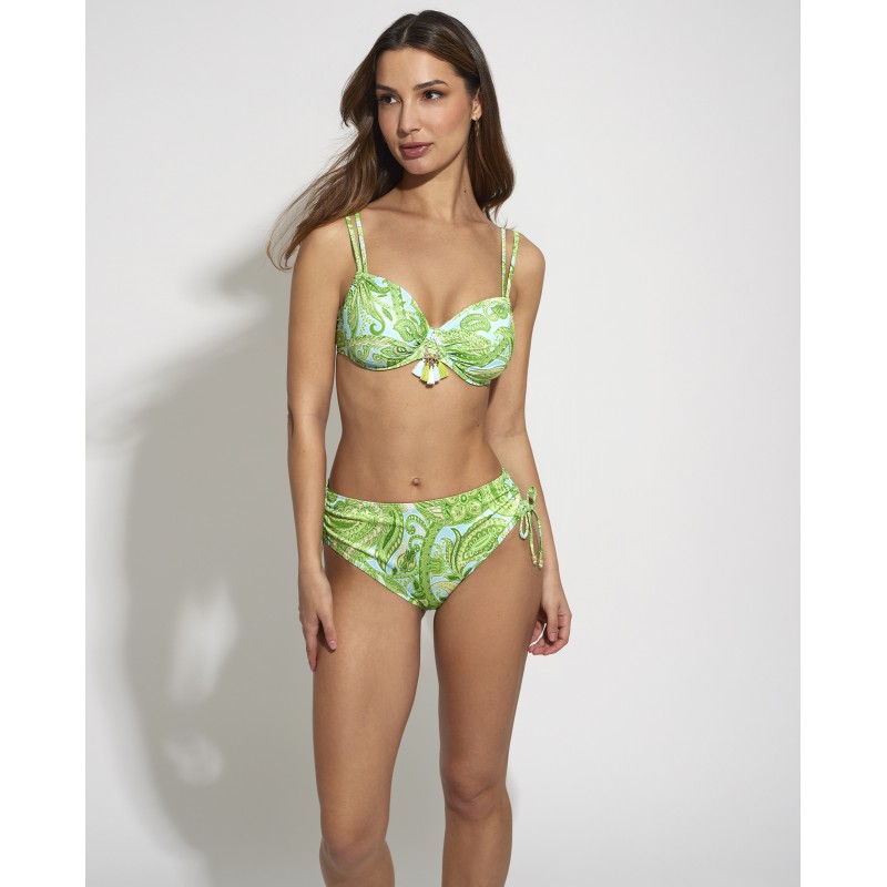 Top de bikini de capacidad, sin relleno. Con aro y tirantes dobles coordinados para una sujeción perfecta. Su diseño étnico le da un toque de originalidad y estilo único, haciendo que esta pieza sea diferente a los demás. Sus colores vibrantes resaltan tus curvas de una manera sutil pero impactante.
