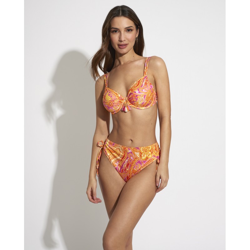 Top de bikini de capacidad, sin relleno. Con aro y tirantes dobles coordinados para una sujeción perfecta. Su diseño étnico le da un toque de originalidad y estilo único, haciendo que esta pieza sea diferente a los demás. Sus colores vibrantes resaltan tus curvas de una manera sutil pero impactante.