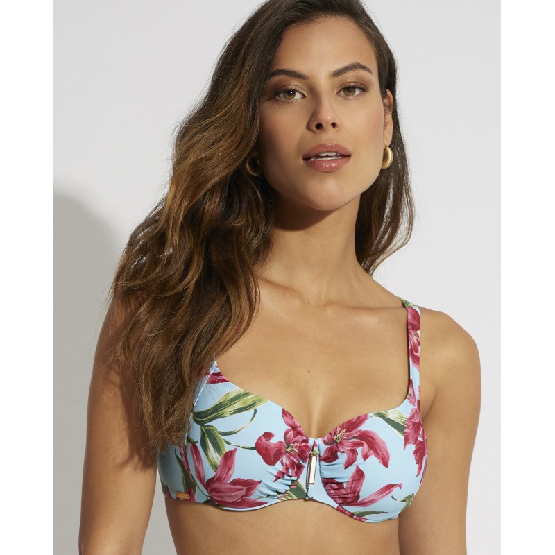 Top de bikini de capacidad sin foam. Con aro y tirantes ajustables para garantizar una sujeción perfecta. Con un estampado tropical que evoca la belleza de una isla paradisíaca. Su color y frescura, transmiten la alegría y la energía de la estación más esperada del año.