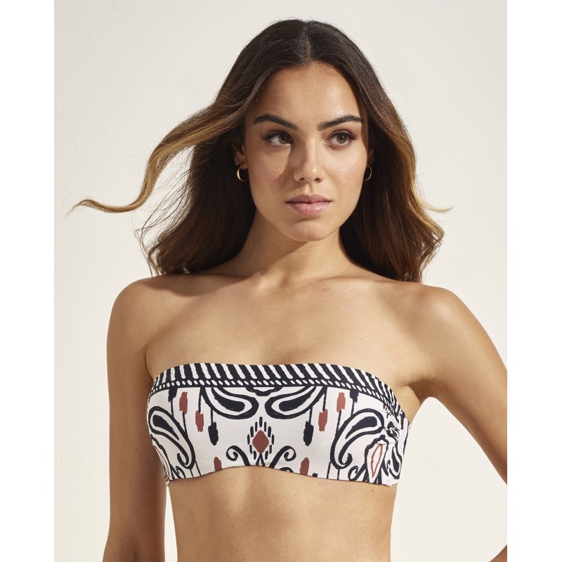 Top de bikini de capacidad bandeau con foam extraíble. Con aro y tirantes ajustables para garantizar una sujeción perfecta. Deja que tu personalidad brille con este diseño, donde cada detalle del estampado cuenta una historia de color y elegancia.