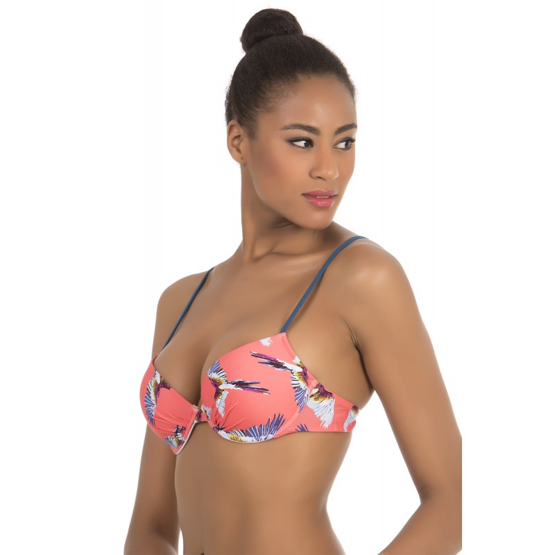 Top de bikini de escote profundo. Con aro y copa de foam. Un diseño clásico con tirantes que aporta una sujeción perfecta. Con estampado de pájaros. De color naranja.