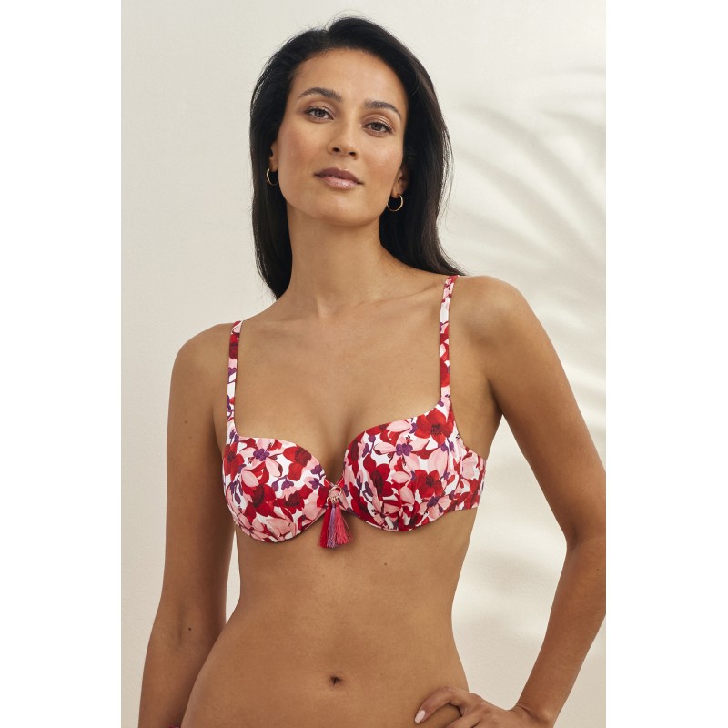 Top de bikini con aro y copa de foam. Un diseño clásico con tirantes que aporta una sujeción perfecta y la máxima comodidad. Su estampado floral lo convierte en una pieza alegre y juvenil.