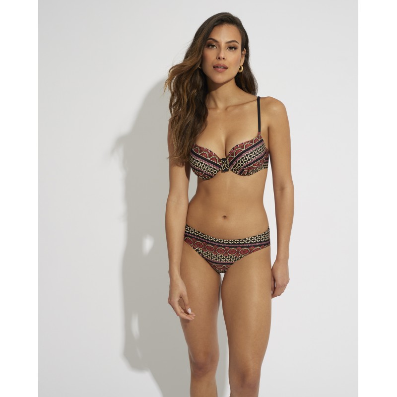 Top de bikini con aro y copa de foam. Con tirantes multiposición que aporta una sujeción perfecta y la máxima comodidad. Con un patrón geométrico de estilo étnico inspirado en diseños tribales y detalles únicos que le dan un toque auténtico y original.