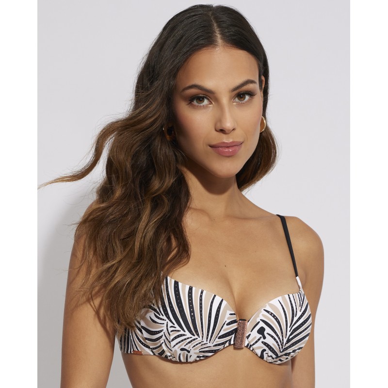 Top de bikini con aro y copa de foam. Sus tirantes son multiposción y aportan una sujeción perfecta y la máxima comodidad.Este estampado es la elección ideal para quienes buscan un look tropical y fresco. Las hojas de palmeras representan el exotismo y la belleza de los trópicos, transmitiendo una sensación de escapismo y libertad.