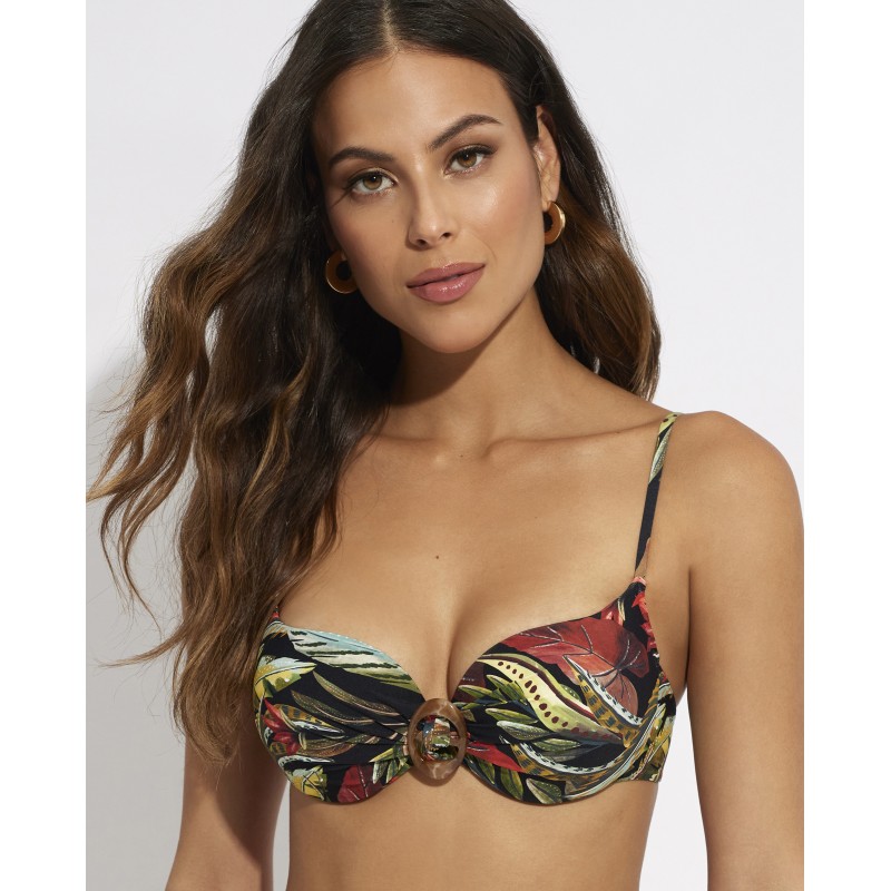 Top de bikini con aro y copa de foam. Un diseño clásico con tirantes que aporta una sujeción perfecta y la máxima comodidad. Este espectacular diseño con tonos vibrantes inspirado en la flora y fauna salvaje refleja la exuberancia y vitalidad de la naturaleza salvaje tropical.
