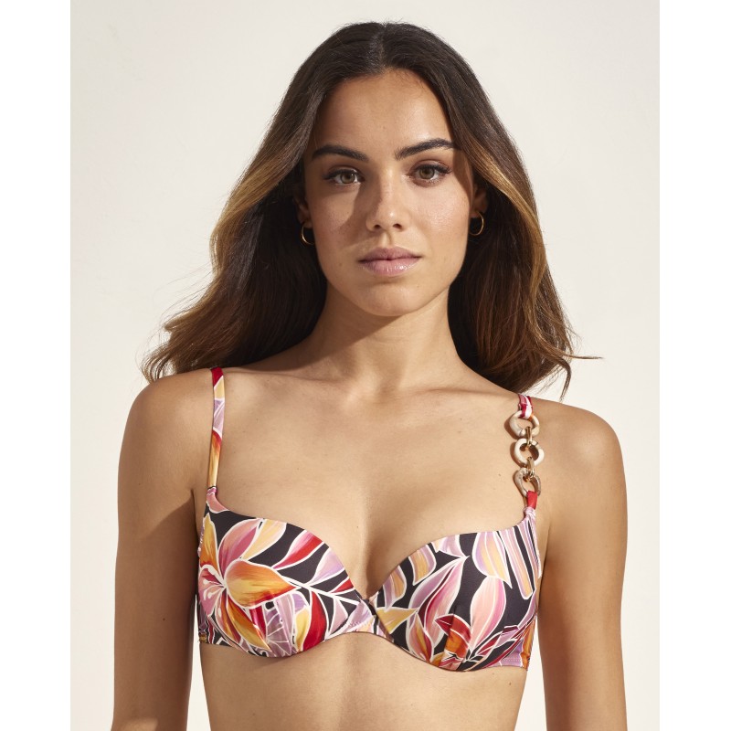 Top de bikini con aro y copa de foam. Aporta una sujeción perfecta y la máxima comodidad. Deja que este estampado floral te acompañe en tus mejores momentos bajo el sol este verano.