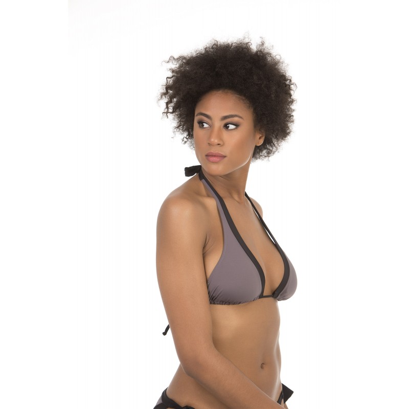 Top de bikini de cortina multiposición. Con copa extraíble y cinco posiciones posibles. Elegante y sencillo. Con vivos con borde en contraste. De color taupe.