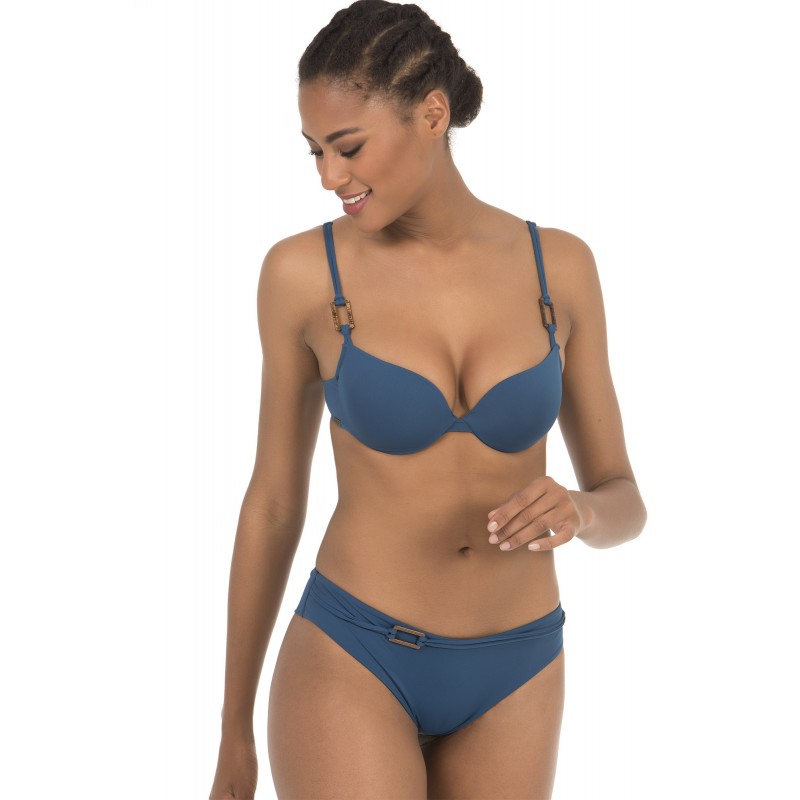 Top de bikini semibalconette con aro. Un diseño sencillo y atemporal. De color azul petróleo.