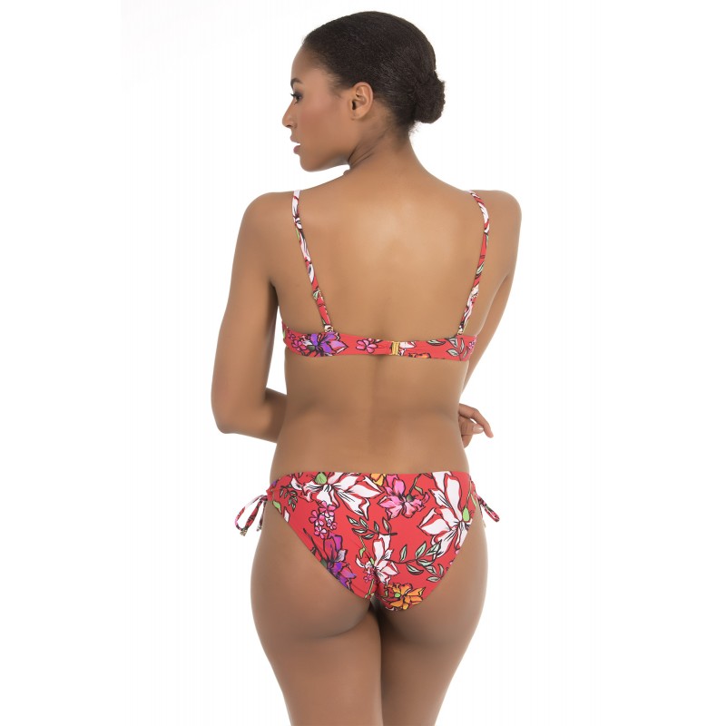 Top de bikini semibalconette con aro y escote fruncido. Con estampdo de flores y muy colorido. De color coral.