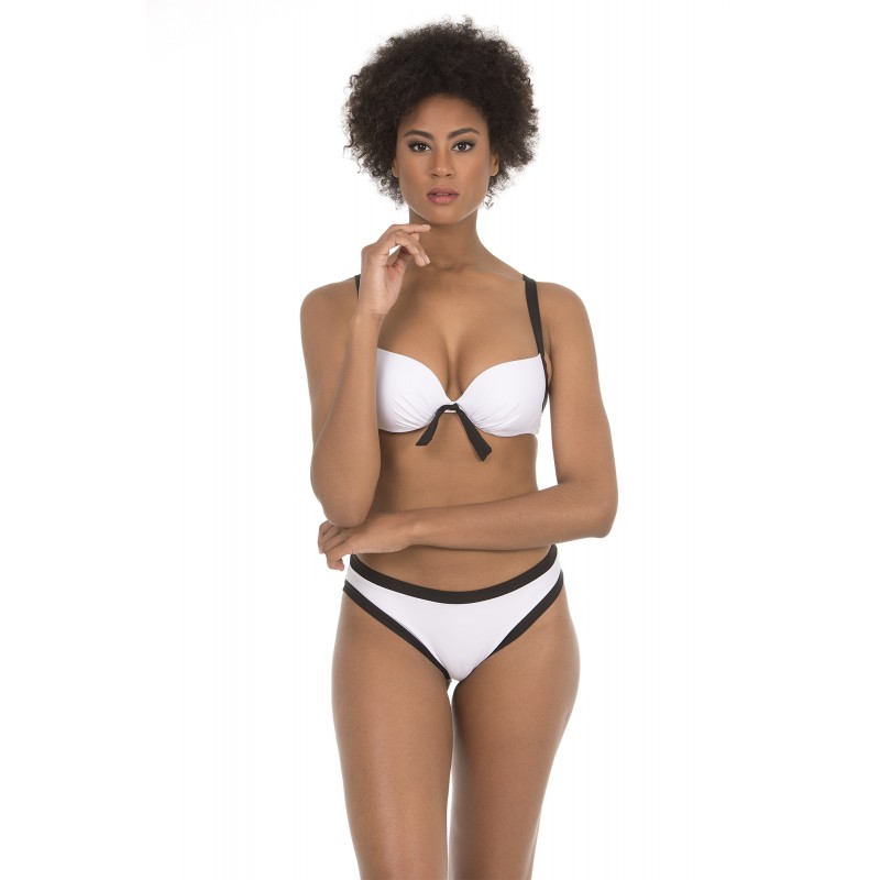 Top de bikini semibalconette con aro y escote fruncido. Con vivos. De color blanco.