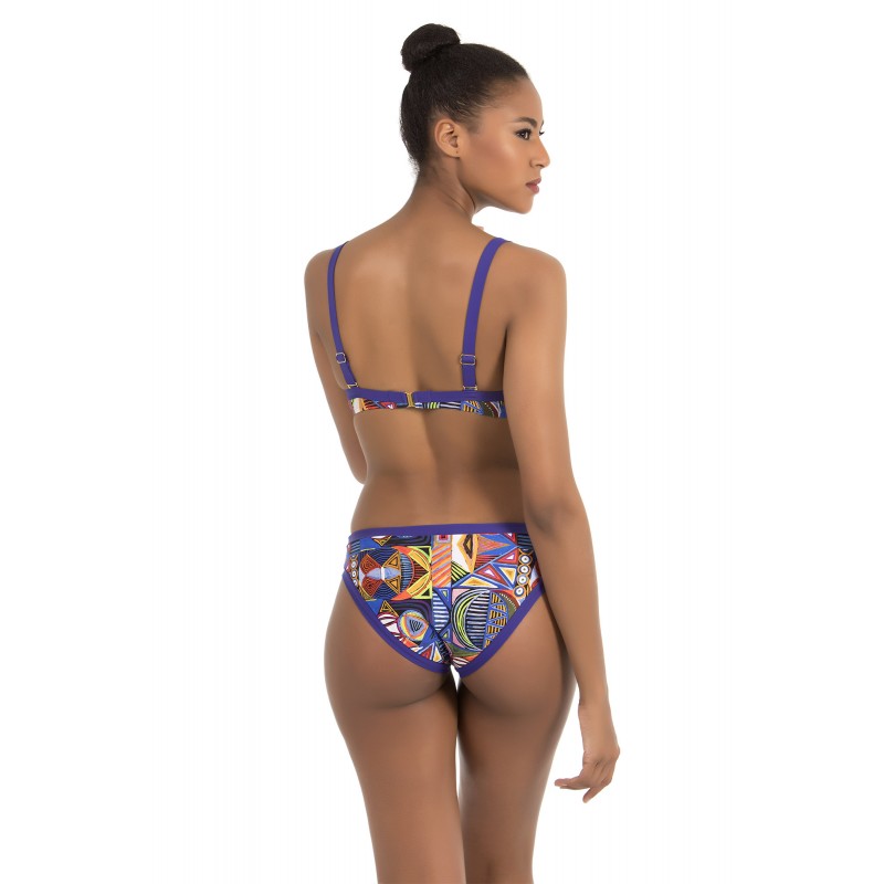 Top de bikini semibalconette con aro. Máxima comodidad. Con un pequeño adorno en el escote y estampado tribal colorido. De color azul.