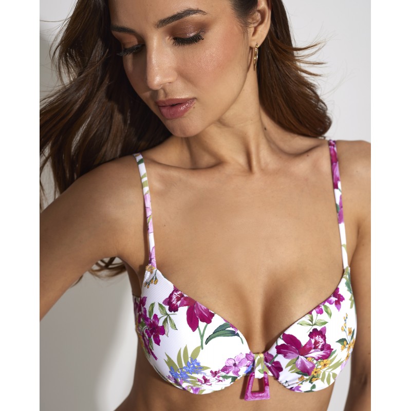 Top de bikini semibalconette con aro. Con tirantes multiposición. Este diseño floral y colorido es perfecto para lucir radiante y vibrante en la playa o la piscina este verano.