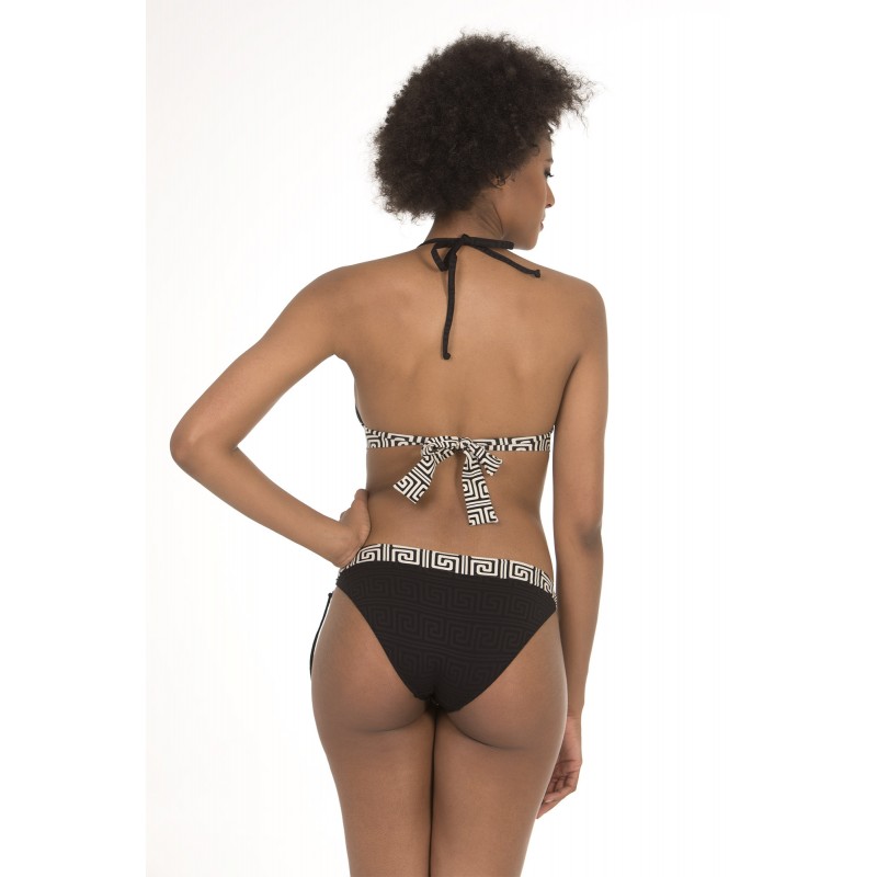 Top de bikini con escote triangular. Con copa extraíble. Liso con estampado de laberinto en el bajopecho y los tirantes. Un diseño sencillo y atemporal. De color negro.