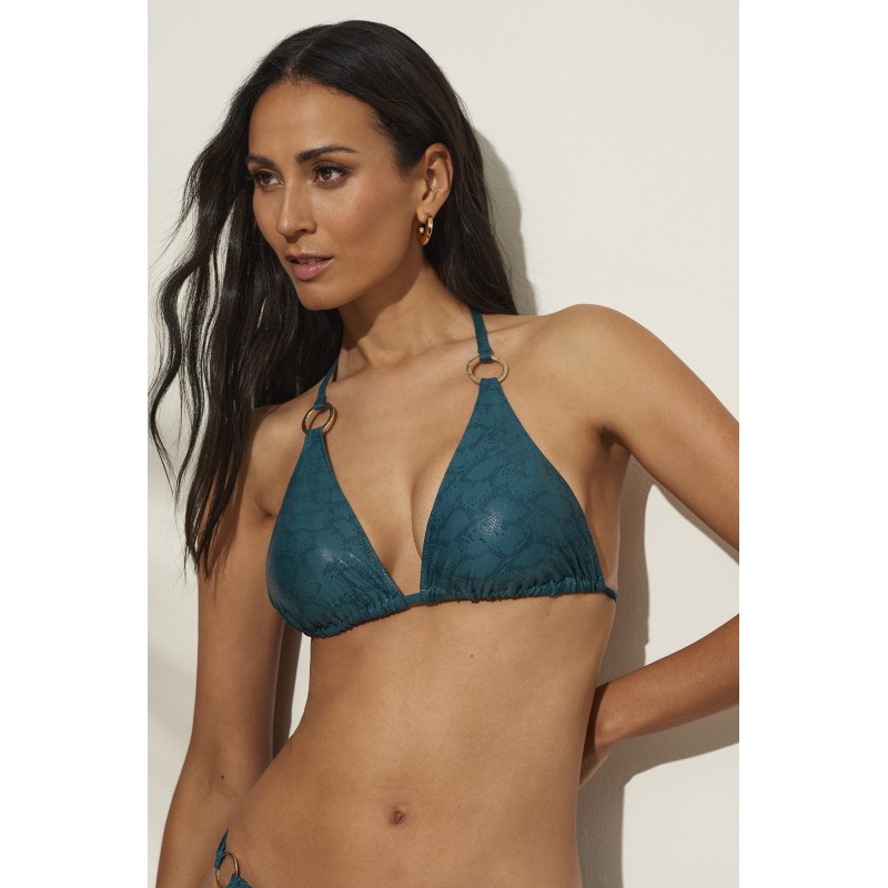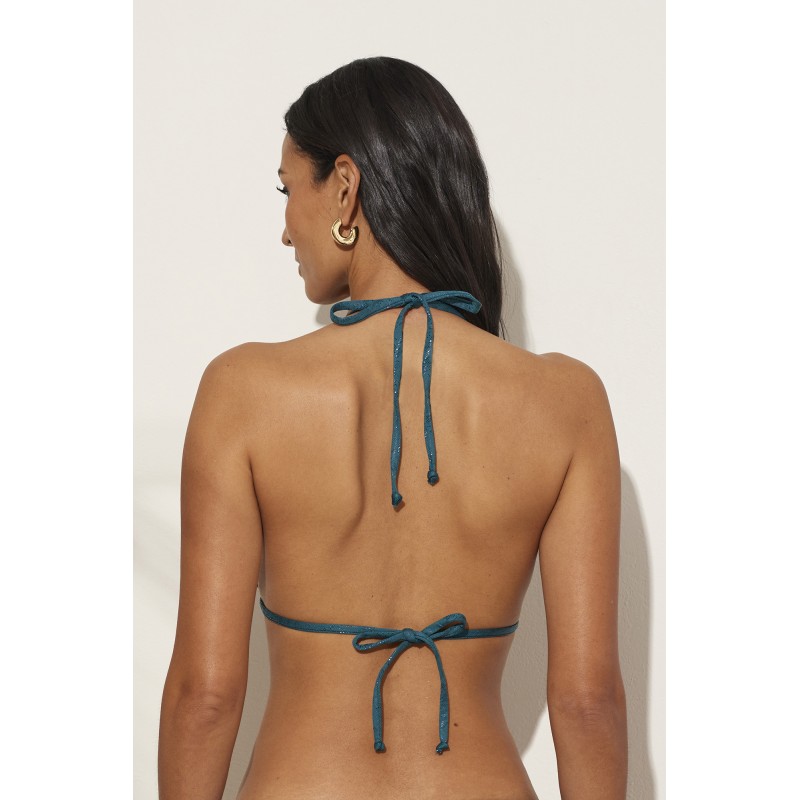 Top de bikini con escote triangular. Con copa extraíble. Con un espectacular tejido reciclado, esta colección tiene un brillo muy especial que captará todas las miradas esta temporada.