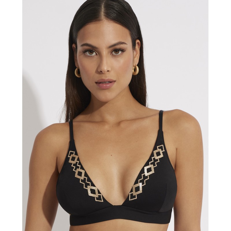 Top de bikini con escote triangular y tirantes multiposición. Con copa extraíble. Este diseño resalta la elegancia del color negro y añade un toque de lujo con sus detalles en dorado, combinación que transmite sofisticación y estilo. Ideal para sentirte espléndida y elegante este verano.