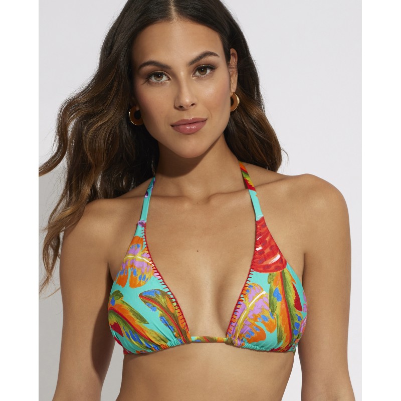 Top de bikini con escote triangular. Con copa extraíble. Con un estampado colorido y vibrante que le dará frescura y vida a tus días de playa o piscina.