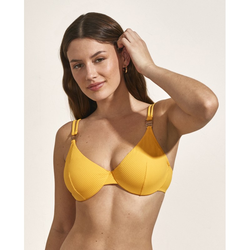 Top de bikini con escote triangular con aro y sin foam. Su ajuste cómodo y seguro permite disfrutar de actividades acuáticas sin preocupaciones, ya sea en la playa o en la piscina.Sin duda, es una opción clásica, práctica y elegante para el verano, ideal para lucir bien mientras te diviertes bajo el sol.