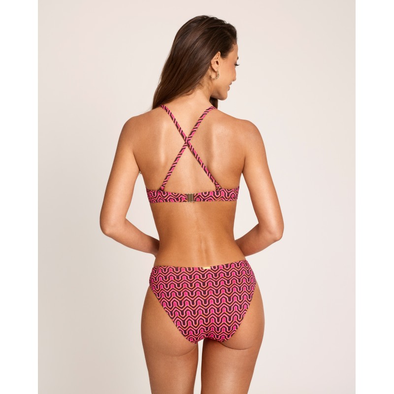 Top de bikini con escote triangular con aro y sin foam. Con un estampado geométrico que aporta dinamismo y un aire veraniego. Una propuesta contemporánea y sofisticada para esta temporada. Está confeccionado con materiales reciclados.