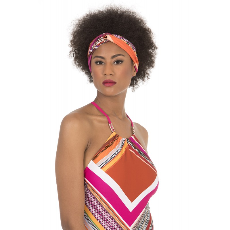 Turbante con estampado pañuelo. Elástico y muy cómodo. Combínalo con el vestido a juego o con tu bañador o bikini. De color rosa fucsia.