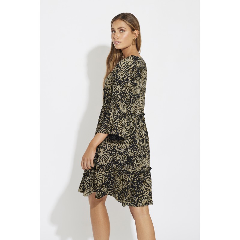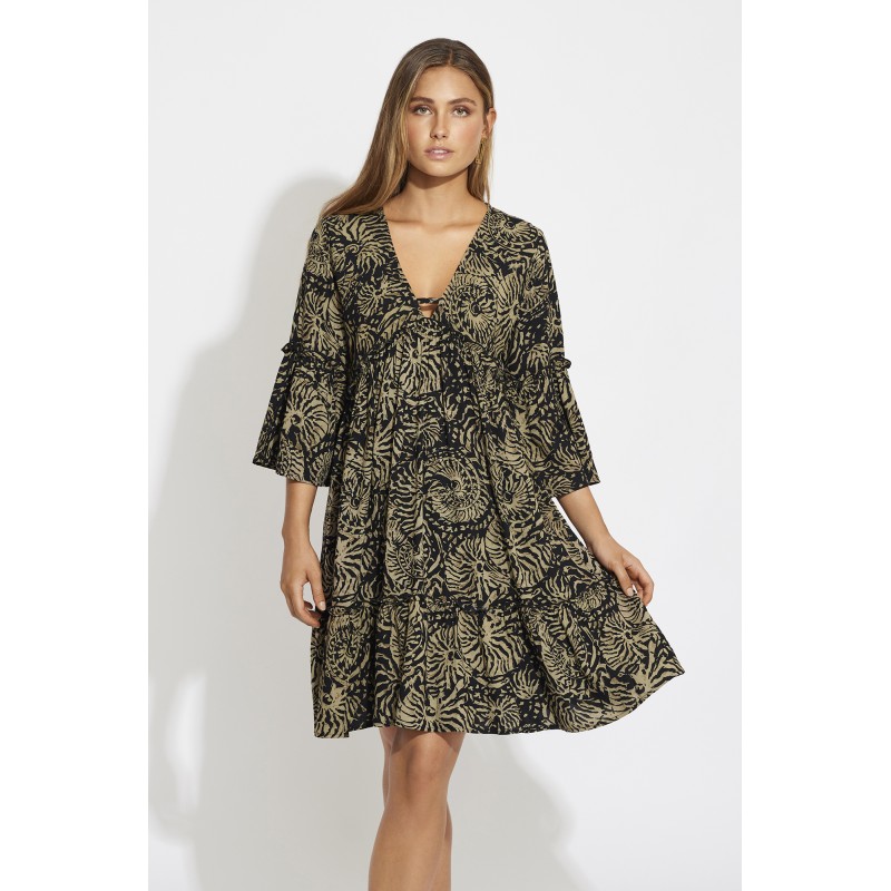 Vestido corto con mangas. Ideal para llevar sobre tu bikini o bañador. Su llamativo diseño étnico de caracolas inspirado en playas soñadas, te cautivará.