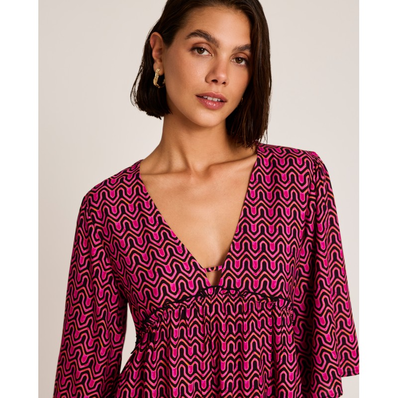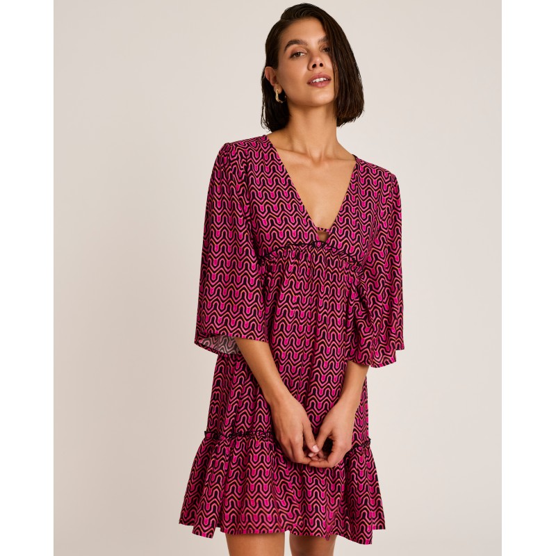 Vestido corto con mangas estilo blusón escote V. Con un estampado geométrico que aporta dinamismo y un aire veraniego. Una propuesta contemporánea y sofisticada para esta temporada. Está confeccionado con materiales reciclados.