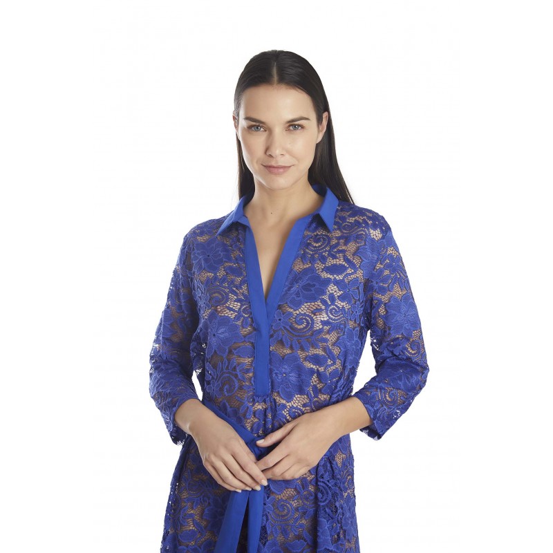 Vestido camisero con cuello de camisa y encaje con motivos florales. Lazo a la cintura a modo de cinturón. Un diseño pensado para no renunciar a la elegancia en tu look de verano.